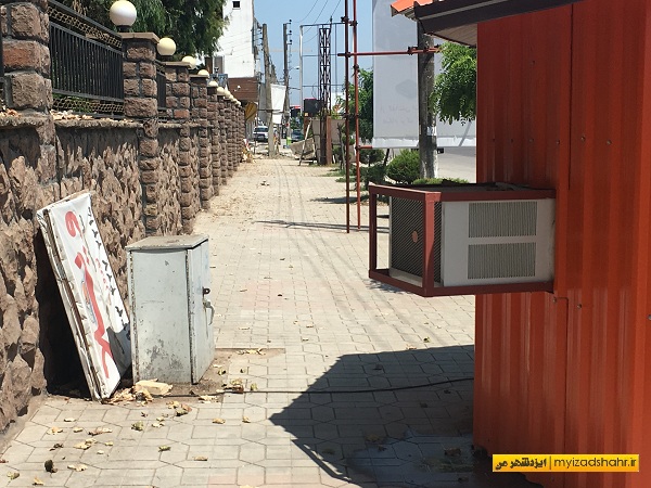در تصویر بالا جانمایی دکه در کمترین فاصله با کیوسک مخابرات و نیز عدم رعایت موارد ایمنی با قرار دادن کولر گازی در نامناسب ترین مکان ممکن، که محل عبور عابر پیاده رو به کمترین مقدار ممکن رسانده و در صورت برخورد عابرین پیاده به محل قرارگیری کولر چه آسیب هایی را به عابرین و با توجه به ارتفاع کم آن بخصوص کودکان خواهد زد.