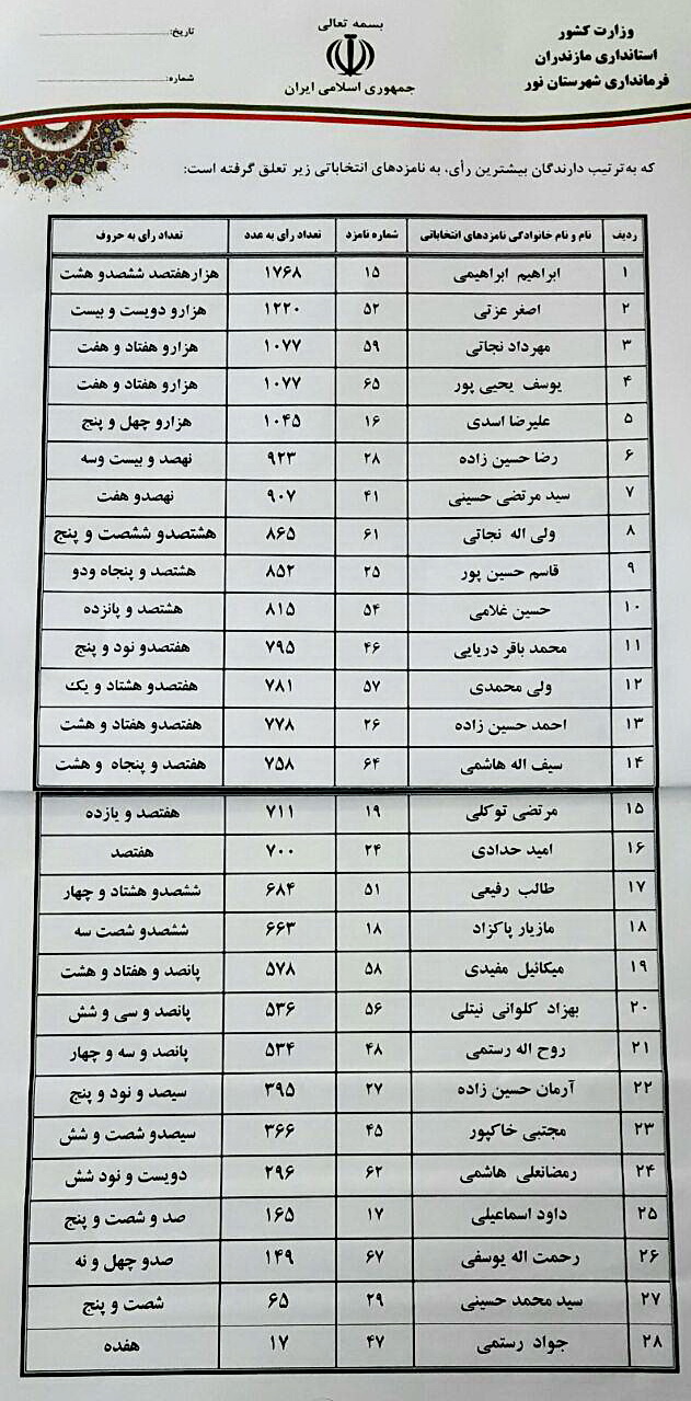 ۱۳۹۶/۳/۵نتايج انتخابات پنجمين دوره شوراى اسلامى شهر ايزدشهر: